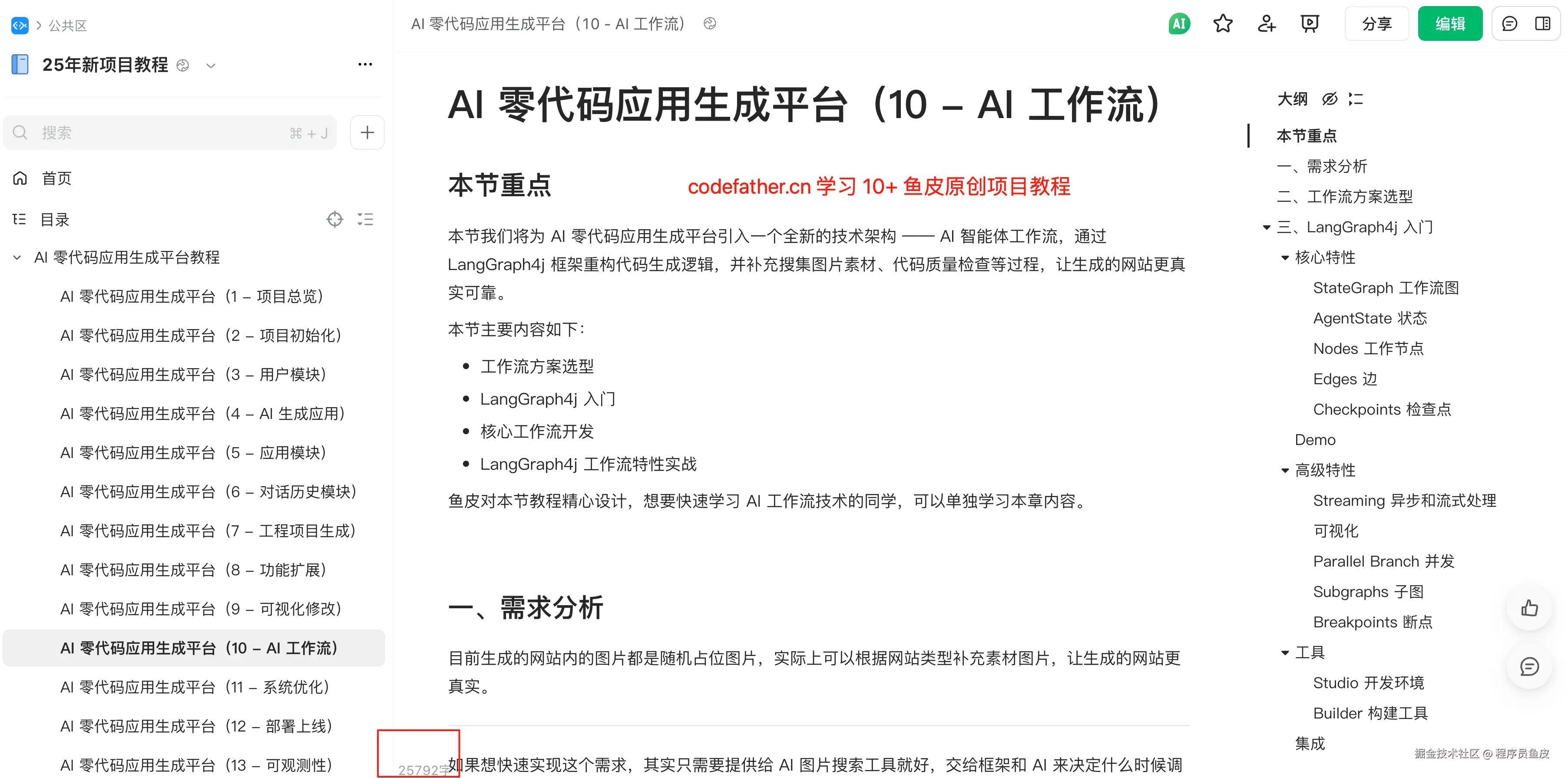 这是一套以 AI 开发实战 + 后端架构设计 为核心的项目教程,基于 Spring Boot 3 + LangChain4j + LangGraph4j + Vue 3 开发的 对标大厂 的 企业级 AI 代码生成平台,带大家掌握新时代程序员必知必会的 AI 智能体开发、AI 工作流等前沿技术,大幅提升求职竞争力!