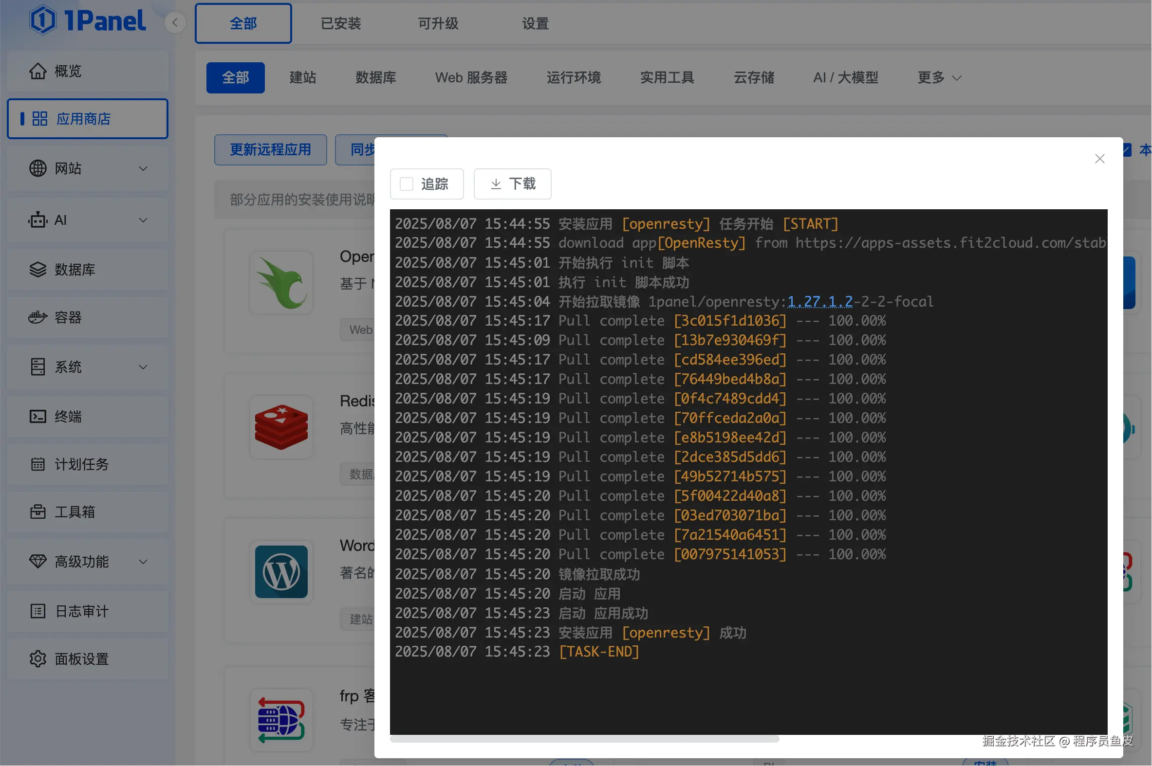安装中,可以看到其实面板是通过容器来运行应用的: