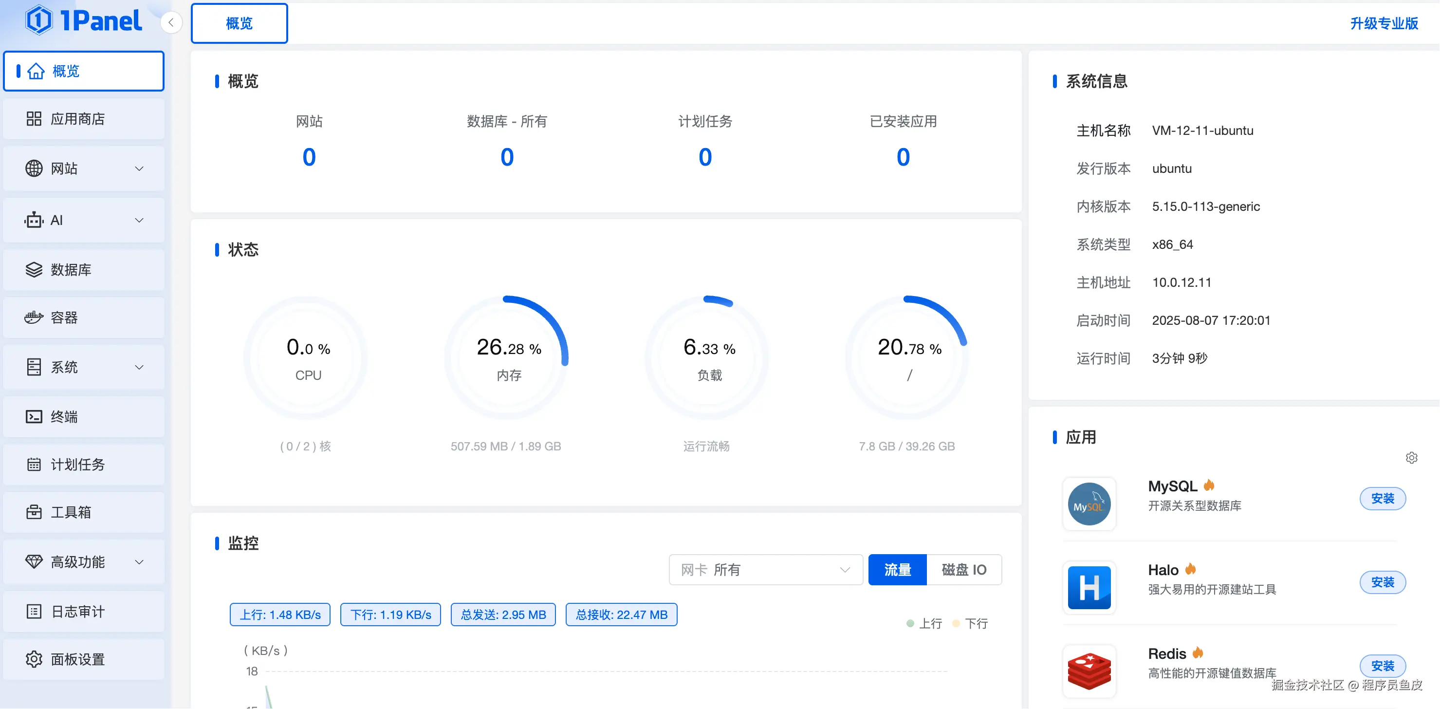 1Panel 是一个现代化、开源的 Linux 服务器运维管理面板,跟宝塔 Linux 类似。提供可视化的服务器管理界面,支持应用商店、容器管理、文件管理、数据库管理等功能,适合中小团队或者个人学习使用,告别使用黑漆漆的命令行来操作服务器。