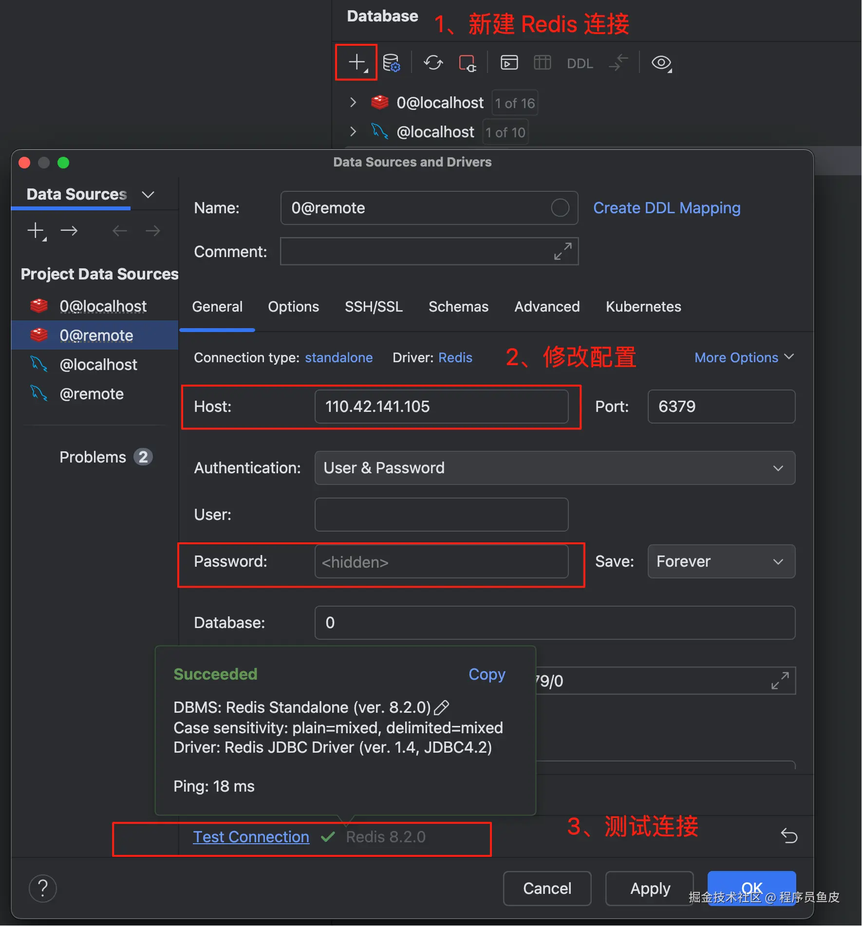 安装完成后,在 IDEA 数据库面板中验证本地能否连接远程 Redis: