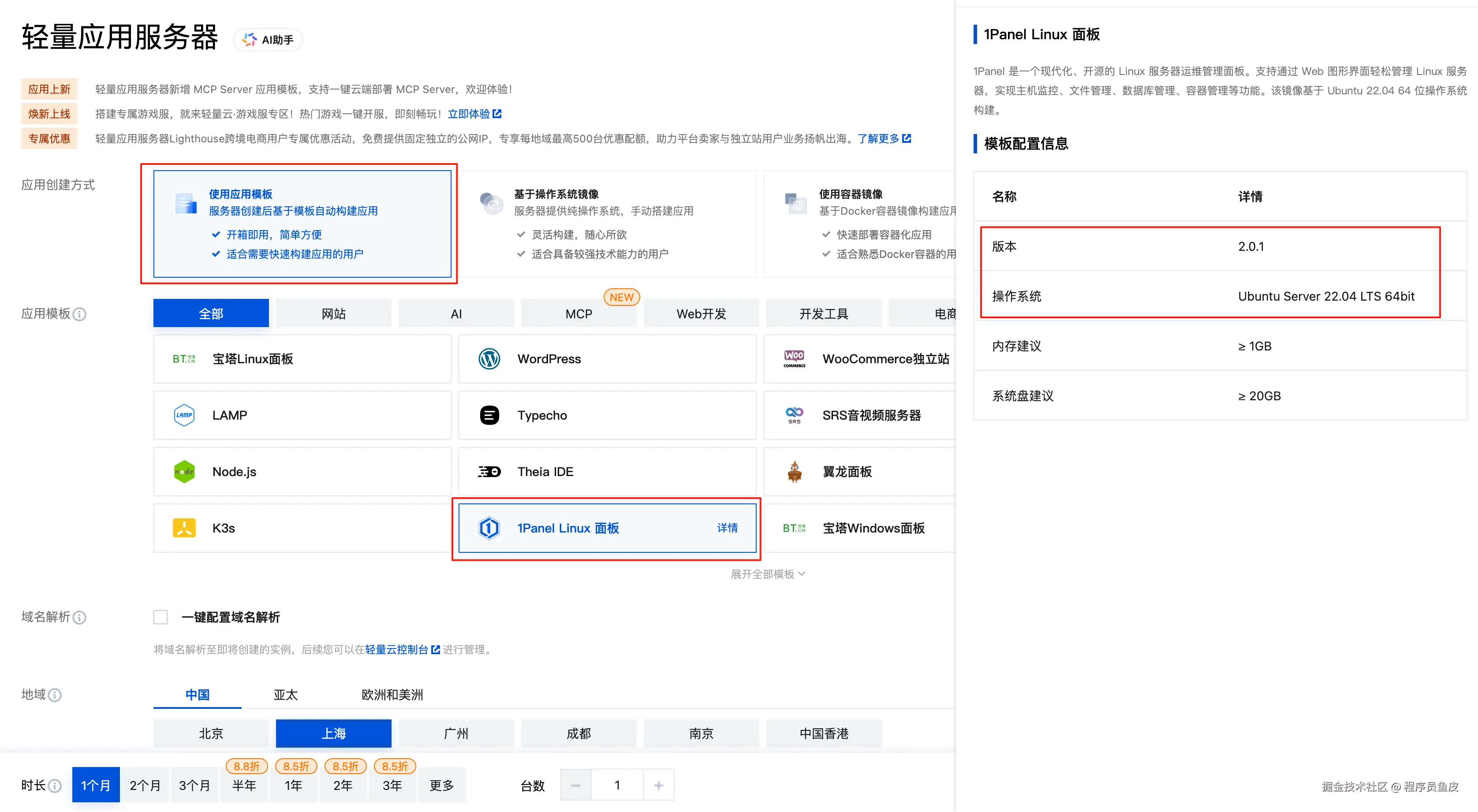 首先购买一台服务器,推荐选择轻量应用服务器,提供了很多开箱即用的模板,帮我们预装了环境和软件,省时省力。