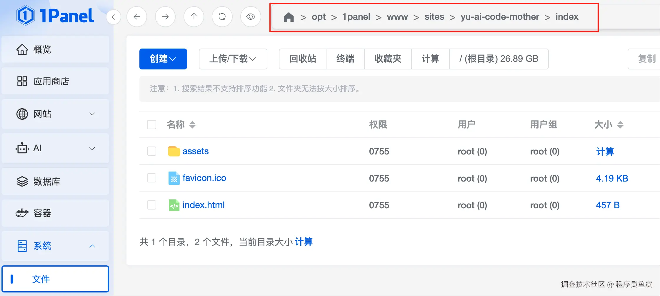 这里我们约定,后端需要确保在 /www/sites/yu-ai-code-mother/tmp 目录下生成临时文件。最简单的办法就是把 jar 包移动到这个 /www/sites/yu-ai-code-mother 目录下运行(或者通过配置文件修改后端写入文件的路径)。