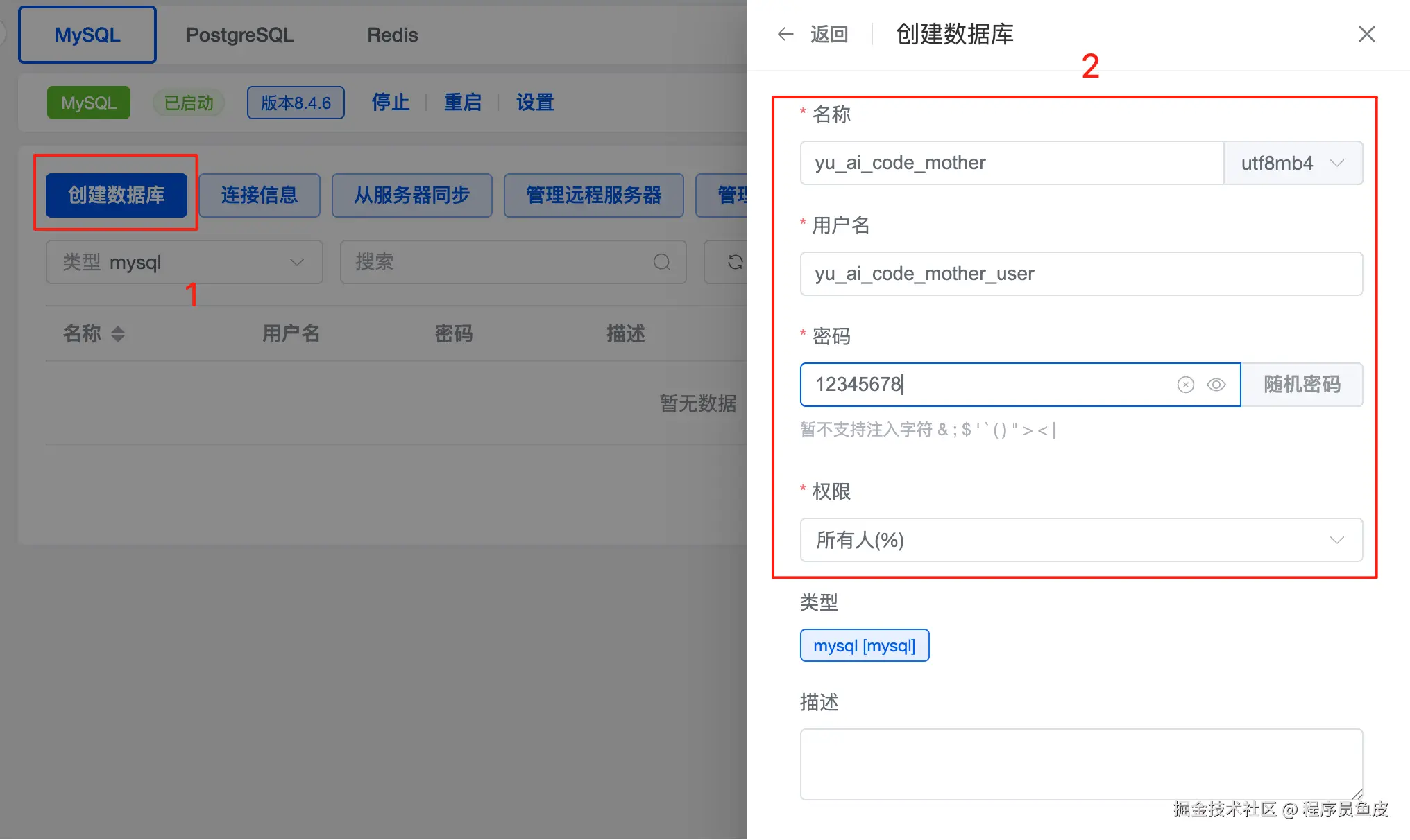 先为后端项目创建一个数据库。数据库名称和我们项目需要的数据库名称保持一致(此处为 yu_ai_code_mother),注意用户名、密码和访问权限: