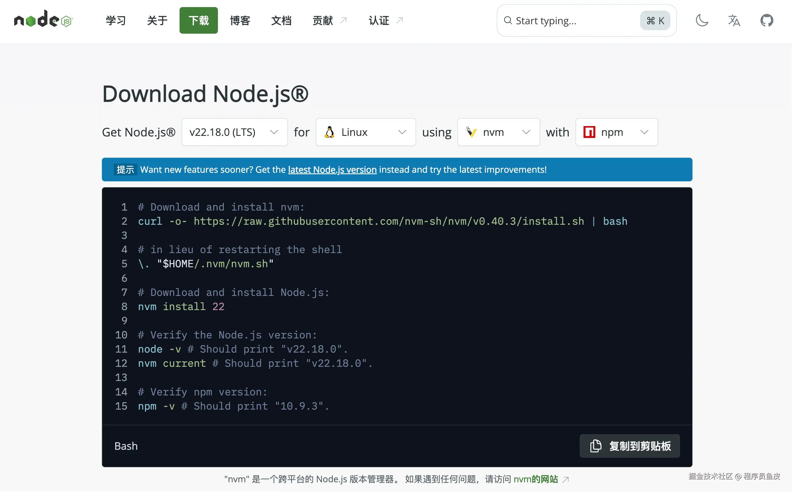 直接去 Node.js 官网 安装,选择 Linux 系统,会看到一堆命令,作用是安装 nvm 这样一个 Node.js 管理器: