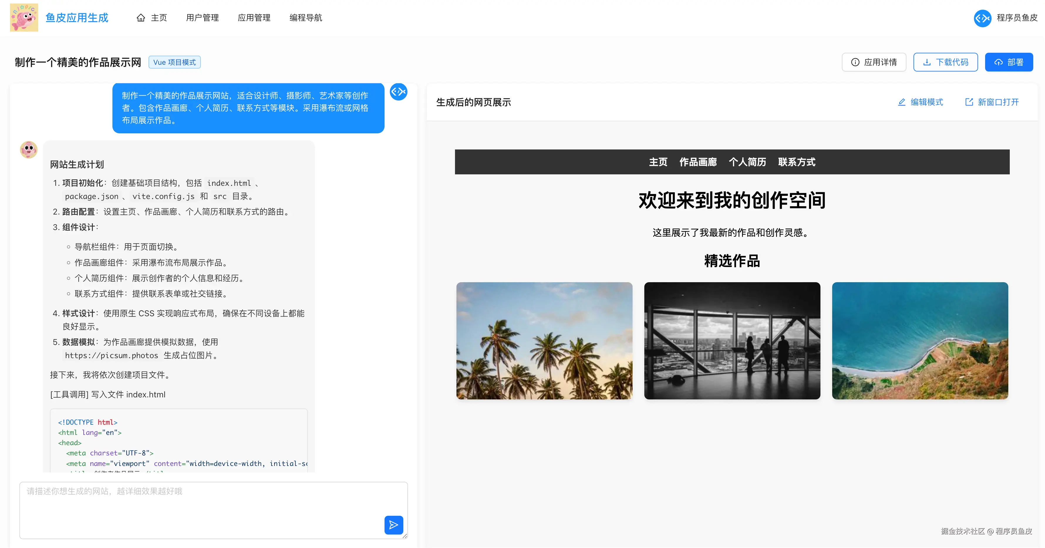 5)再来生成一个更复杂的网站,通过 AI 智能路由触发 Vue 工程项目生成模式。