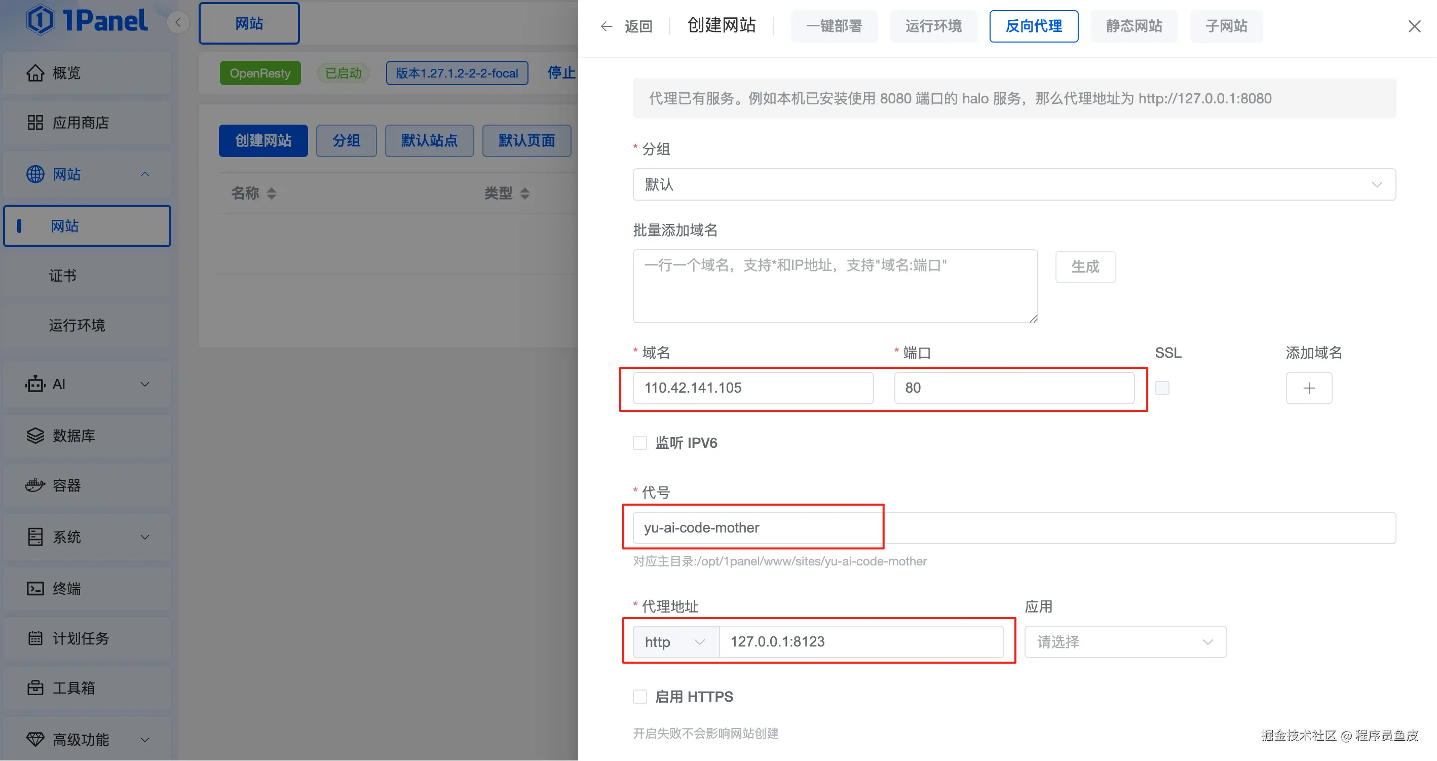 先创建一个网站(相当于新建 Nginx 站点),选择 反向代理 类型,域名填写当前服务器 IP 或者自己的域名,代号最好用项目名称: