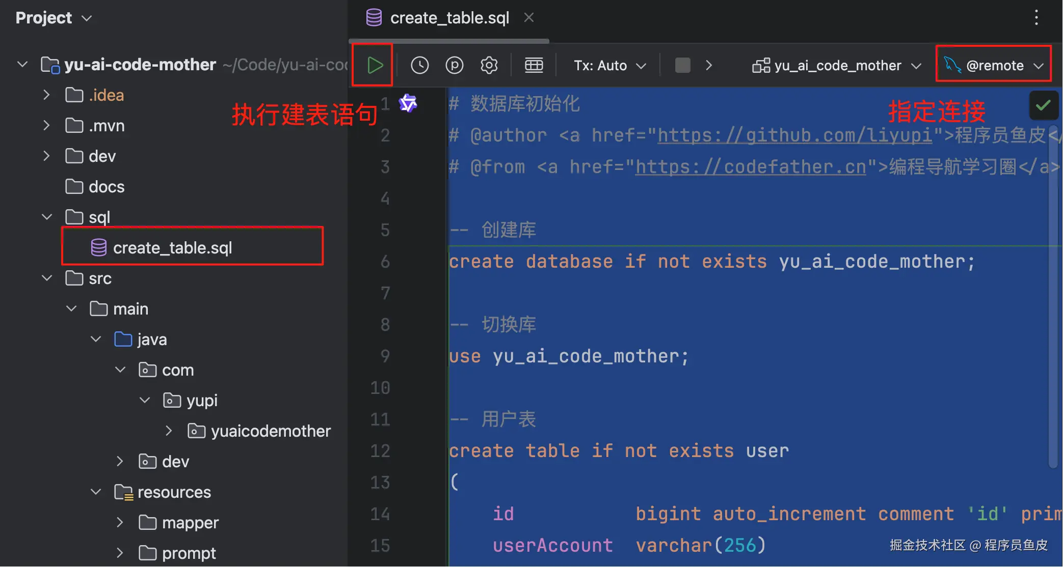 执行鱼皮提供的 SQL 脚本,初始化库表: