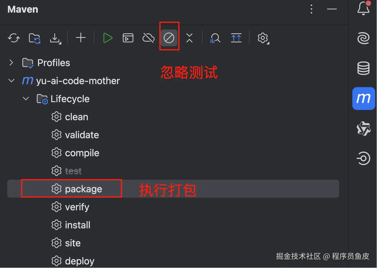 在 IDEA 中打开后端项目,忽略测试并打包: