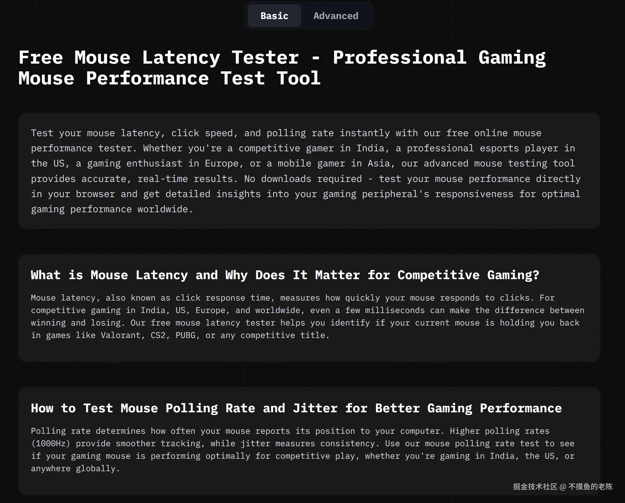 Mouse Tester Pro是一款浏览器-based鼠标和触摸输入测试软件,提供精准的点击反应时间分析、DPI准确性测试、节奏点击精度测试及输入事件可视化,适合游戏玩家和开发者使用。