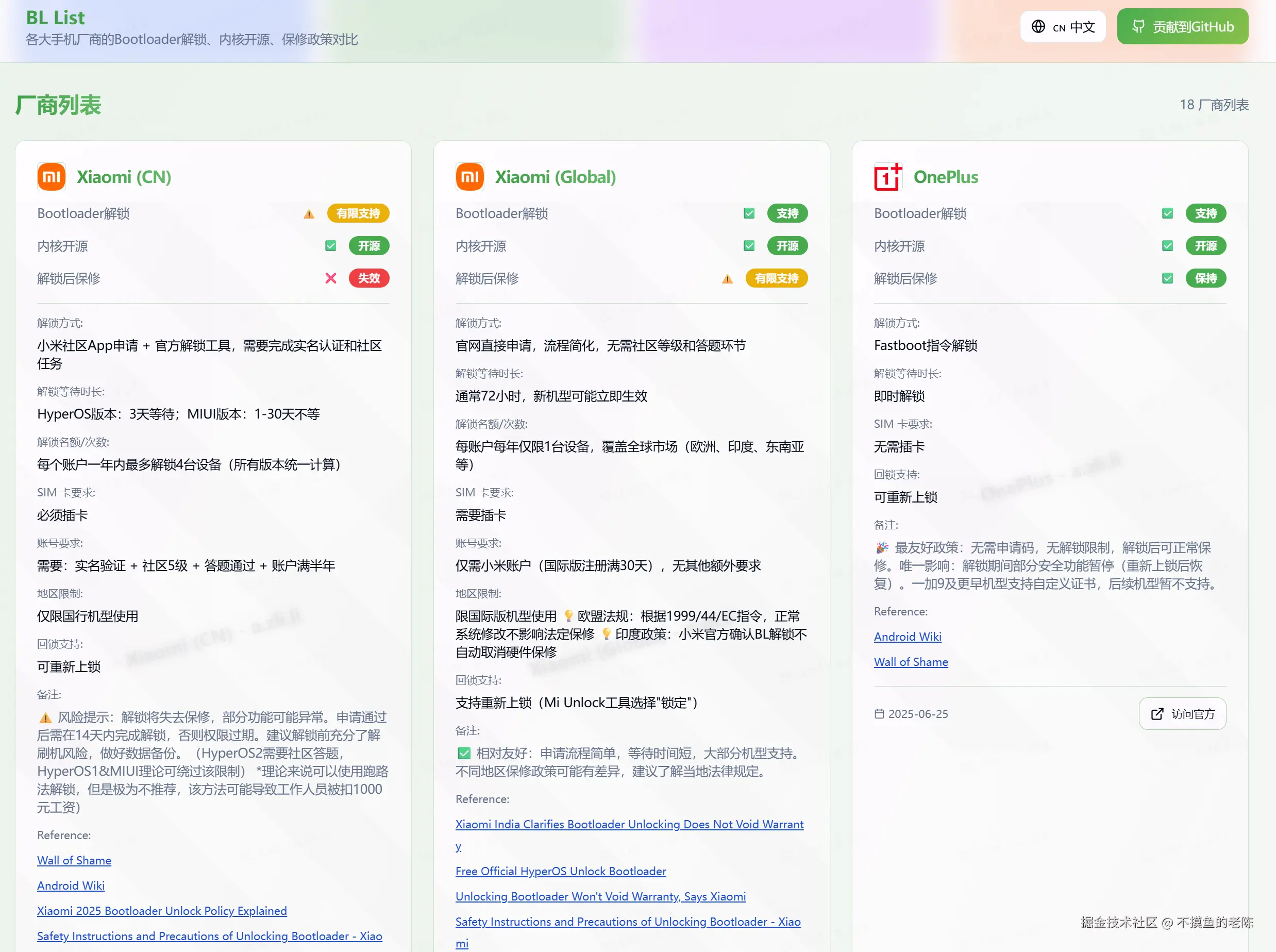BL List是一个安卓手机厂商解锁政策对比网站,提供BL解锁状态、内核开源情况及解锁后保修政策等关键信息,已收录18家手机厂商。