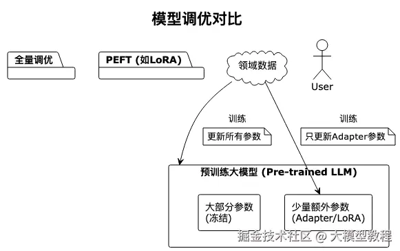 - PEFT (Parameter-Efficient Fine-Tuning) : 参数高效微调。只训练模型的一小部分参数(如通过LoRA技术),就能达到接近全量调优的效果,极大降低了硬件门槛。