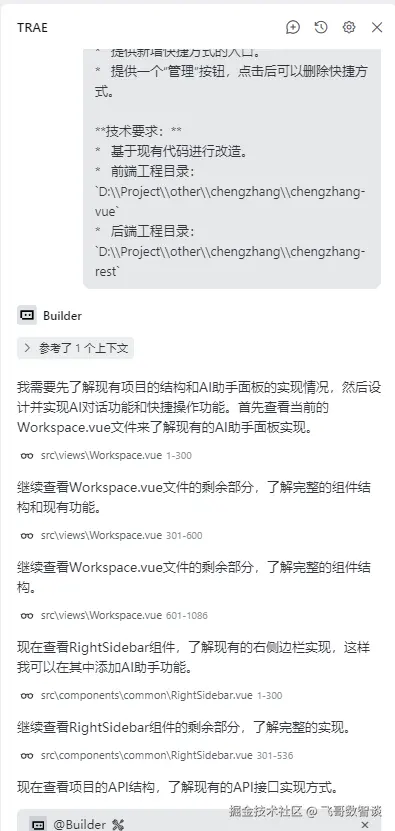 首先分析原有代码,大部分 AI 代码助手都有这个能力,但不同的 IDE 分析结果千差万别,TRAE 在这方面个人感觉还不错。