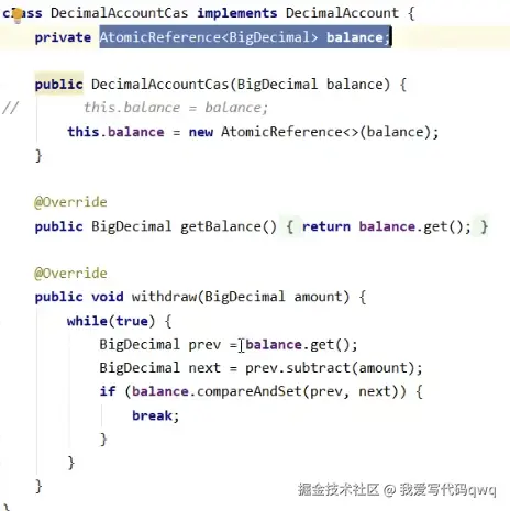 所以用atomicreference来保护bigdecimal,如上的例子。下面withdraw部分涉及了多个操作,所以不能保证线程安全。
