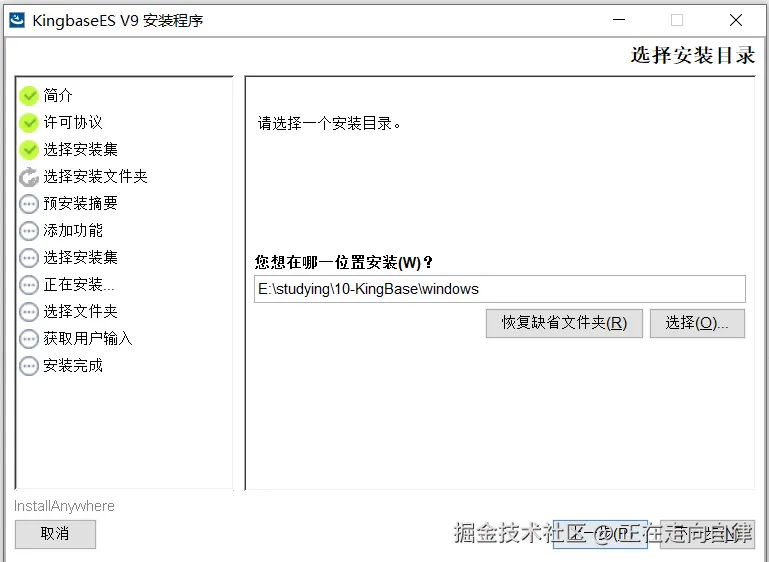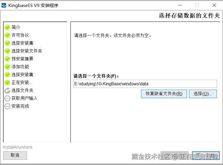 6.正在安装,选择一个文件夹,用于存储数据的,改文件夹必须为空(如下图所示)