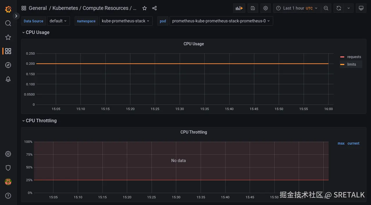 即使在这种情况下使用 Prometheus 来监控与 K8s 集群相关的方面,监控其性能也至关重要,以确保它不会成为瓶颈。如果您的目标数量较多或指标较高,请根据需要调整分配给 Prometheus 的资源。