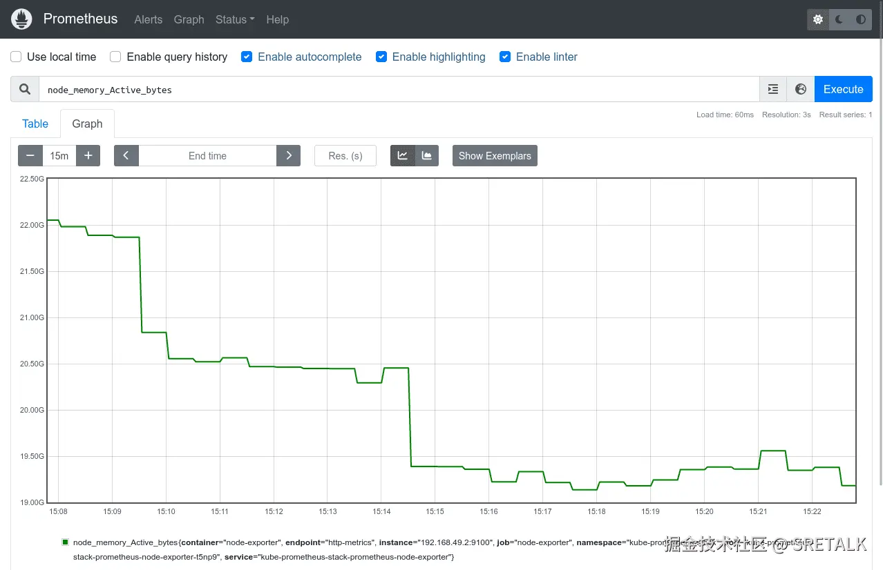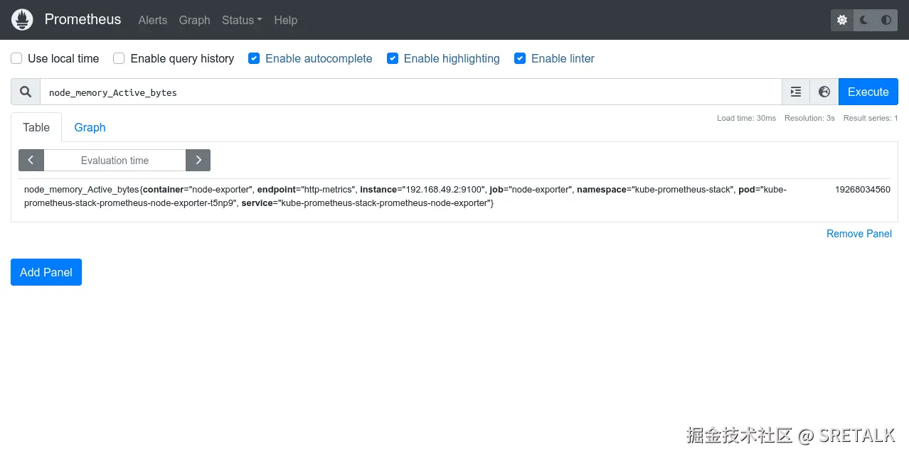 尝试选择 node_memory_Active_bytes 指标,该指标显示集群中每个节点的内存消耗。按“执行”按钮运行查询。结果将显示在 Table 中: