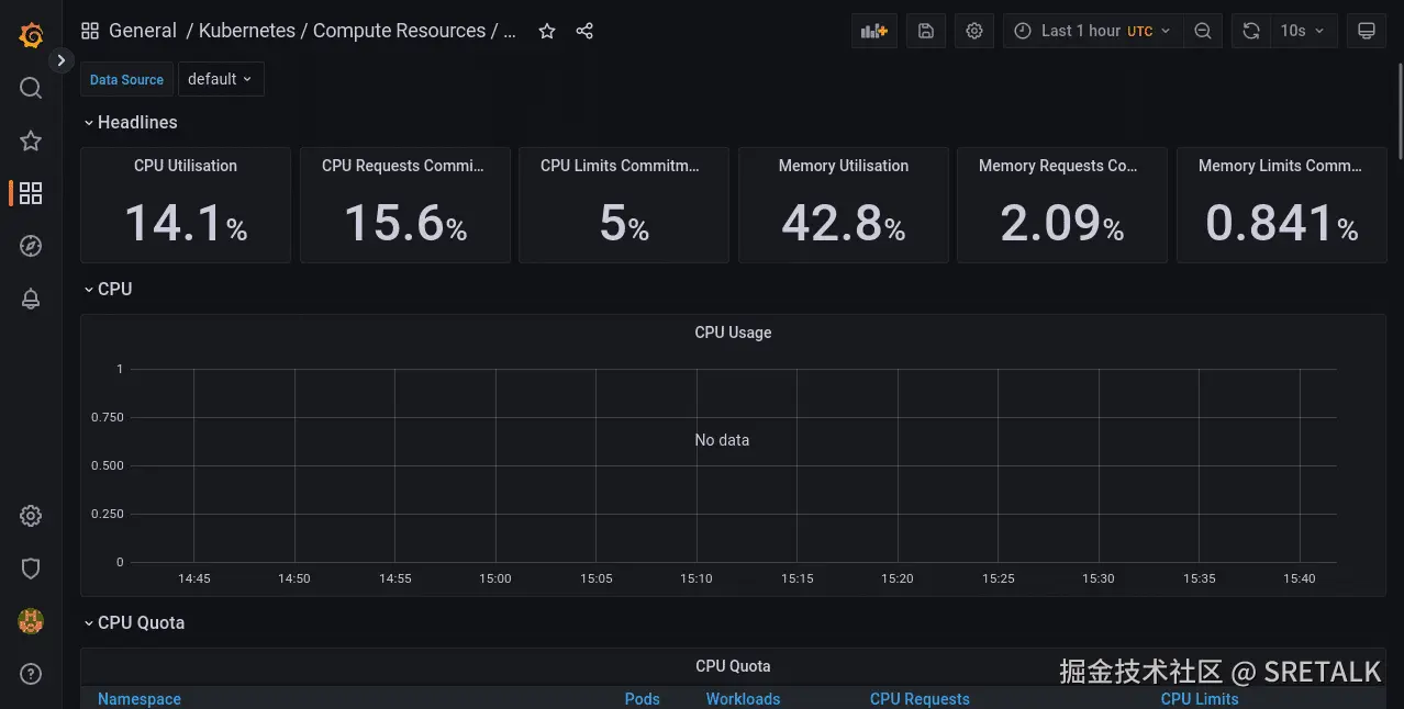 此仪表板显示单个 Pod 的资源请求、限制、配额和利用率。你可以从屏幕顶部的下拉列表中选择要查看的命名空间和 Pod。