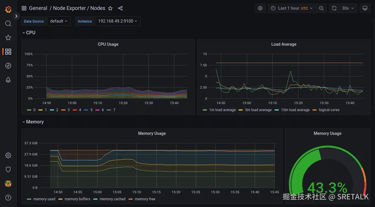 Node-Exporter 收集的数据由此仪表板提供。它显示了每个节点的详细资源利用率信息。您可以使用仪表板顶部的“实例”下拉列表更改所选节点。