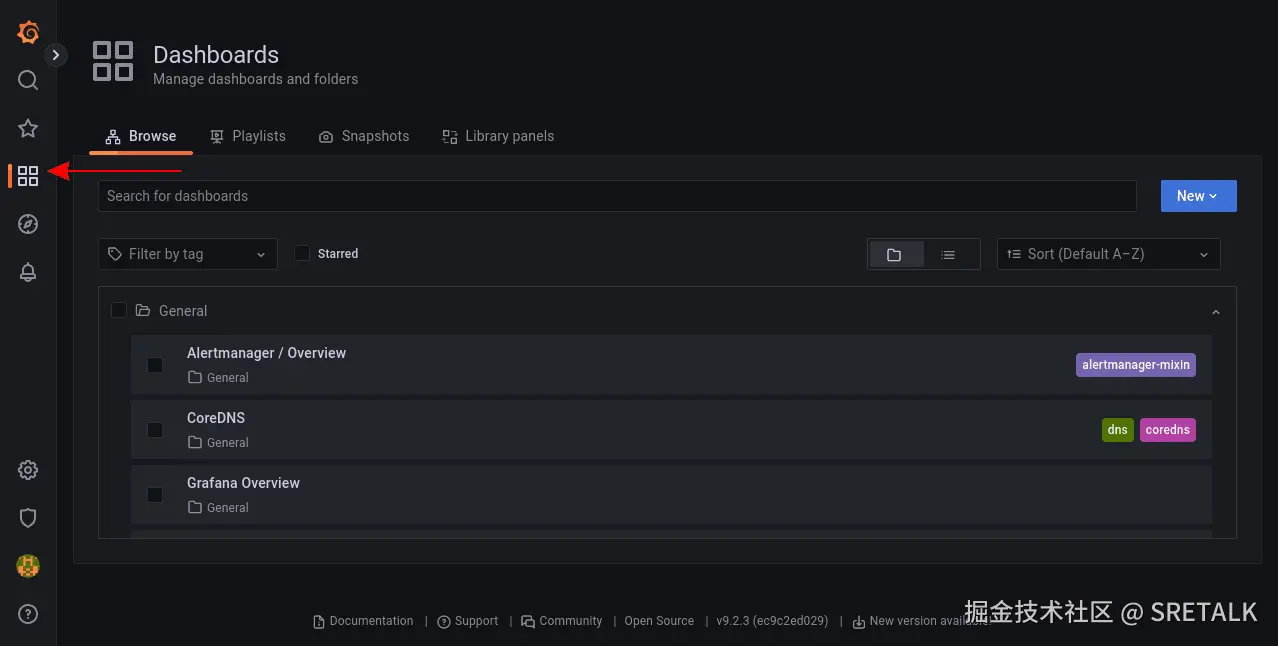 使用侧边栏切换到“仪表板”屏幕。它的图标是四个排列成类似玻璃板的正方形。在这里可以找到所有已保存的仪表板,包括 Kube-Prometheus-Stack 部署附带的预构建仪表板。