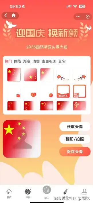 这里头像分类有热门、国旗、渐变、清爽、表白祖国、其它供选择,进入到国庆头像界面后,这里有两种方式生成头像