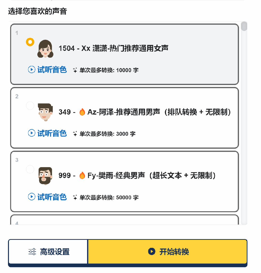 通过高级设置,你还能添加背景音乐、调节语速、音量、语调,自定义输出格式,并灵活插入停顿,提升配音自然度。