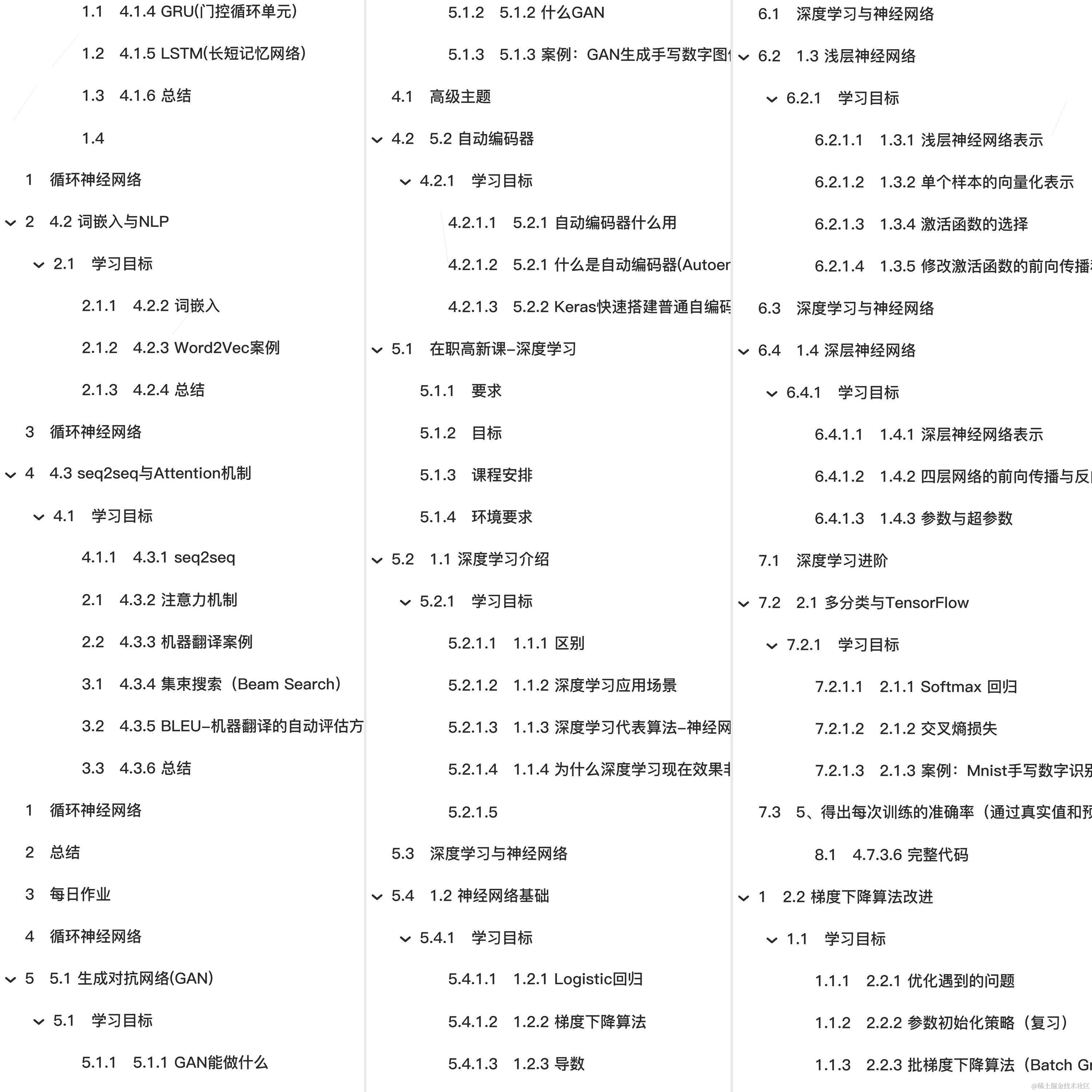 🏆🏆🏆教程全知识点简介:1.1 深度学习介绍 深度学习与神经网络 1.2 神经网络基础 1.3 浅层神经网络 2.1 多分类与 TensorFlow 5、得出每次训练的准确率(通过真实值和预测值进行位置比较,每个样本都比较) 2.2 梯度下降算法改进 2.3.4 其它正则化方法 2.4 BN 与神经网络调优 3.1 图像数据与边缘检测 3.2 卷积神经网络(CNN)原理 3.3 经典分类网络结构 4.1 循环神经网络 4.1.4 GRU(门控循环单元) 4.1.5 LSTM(长短记忆网络) 4.2 词嵌入与 NLP 学习目标 4.2.2 词嵌入 4.2.3 Word2Vec案例 4.3 seq2seq 与 Attention机制 4.3.2 注意力机制 4.3.3 机器翻译案例 4.3.4 集束搜索(Beam Search) 4.3.5 BLEU-机器翻译的自动评估方法 4.7.3.6 完整代码 5.1 生成对抗网络(GAN) 5.2 自动编码器
