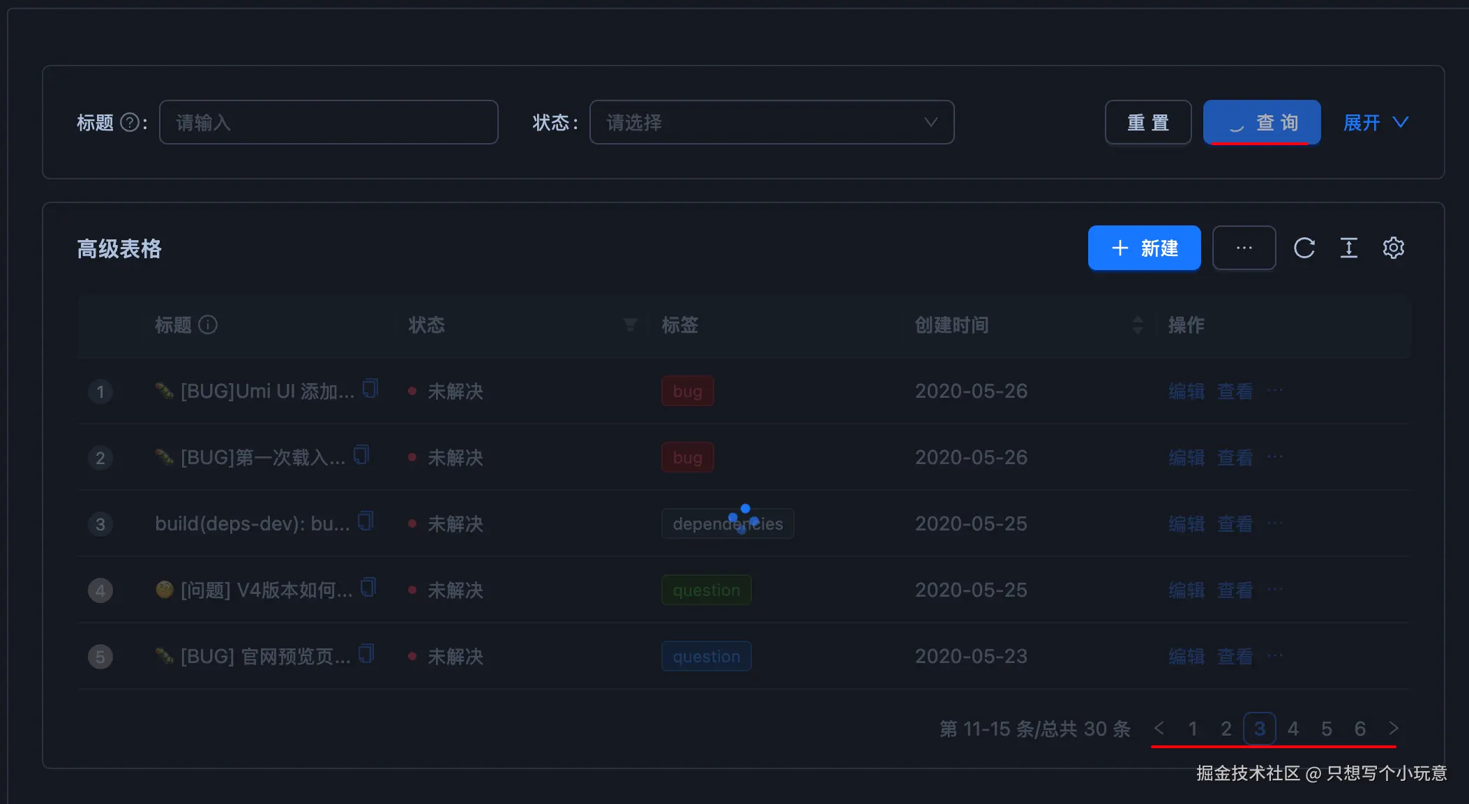下图是一个在请求中给 搜索、分页 等操作添加 loading 的一个示例:procomponents.ant.design/en-US/compo…
