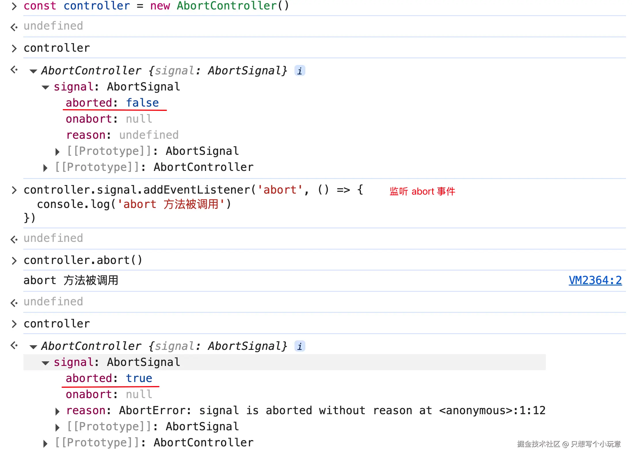 AbortController实例中的signal.aborted用来表示请求是否被终止,初始值为false- 执行