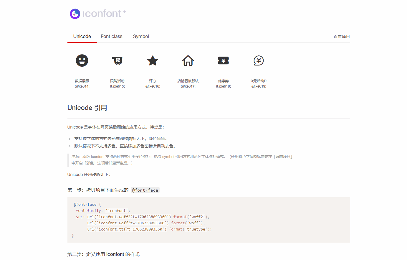 并且它这里提供了三种使用方式:Unicode实体编码方式、FontClass类名称调用、Symbol