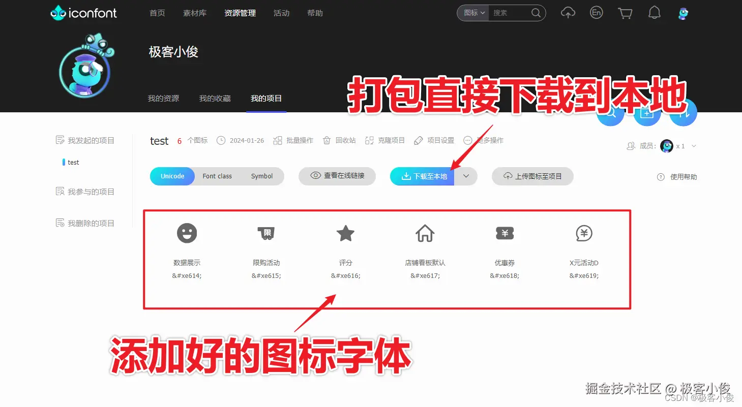 接着会自动跳转到你自己账号的项目管理页面, 你所新建的项目和添加到项目中的图标字体都在这里!