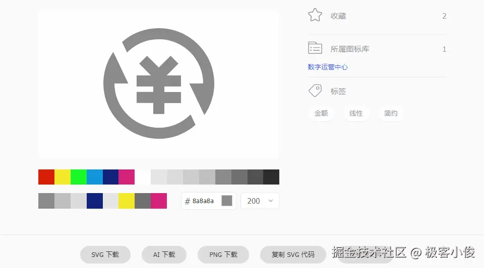 其中这里的直接下载就是直接把这个图标当成文件图片的形式下载到本地进行使用, 你也可以根据需求调整颜色和图标格式, 支持svg、ai、png