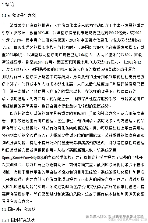 《医疗问诊拿药系统》是一套基于现代Web技术栈构建的综合性医疗服务管理平台,采用B/S架构设计,支持Java+SpringBoot和Python+Django两种后端技术实现方案。系统前端采用Vue框架结合ElementUI组件库构建用户界面,后端使用SpringBoot框架整合Spring、SpringMVC和MyBatis技术栈,数据存储基于MySQL关系型数据库,开发环境支持IDEA和PyCharm两种主流IDE。该系统涵盖了医疗服务的完整业务流程,包括系统首页展示、用户管理、医生信息管理、排班信息设置、预约问诊功能、就诊信息记录、病历信息管理、知识分类体系、健康资讯发布、处方信息管理、药品分类管理、药品信息维护、药品入库出库管理等15个核心功能模块,同时配备系统管理和个人中心功能。系统通过模块化设计实现了医患信息管理、预约调度、诊疗记录、药品库存管理等医疗机构日常运营的关键环节,为用户提供了从预约挂号到拿药取药的全流程数字化医疗服务体验,具备良好的可扩展性和实用性,适合作为计算机专业毕业设计项目进行深入学习和实践。