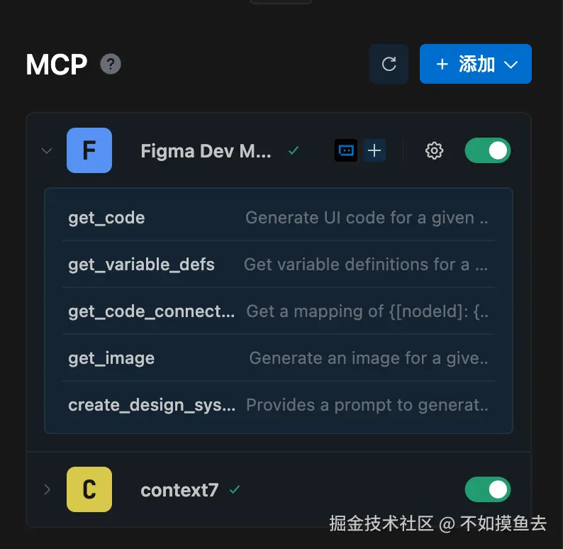 看到如下图,Figma MCP 即可使用了,其他 MCP 接入方案也大同小异