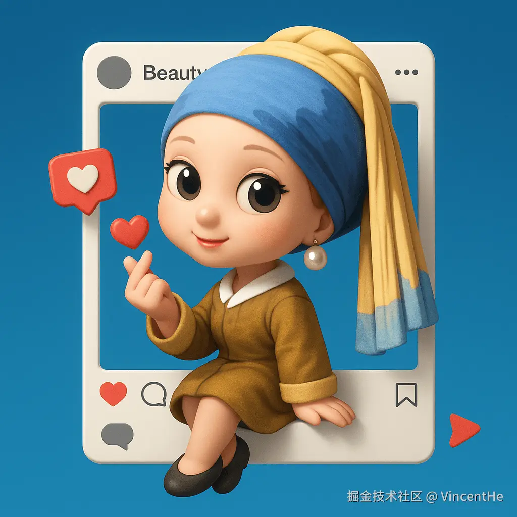 根据所附照片创建一个风格化的3D Q版人物角色,准确保留人物的面部特征和服装细节。角色的左手比心(手指上方有红色爱心元素),姿势俏皮地坐在一个巨大的Instagram相框边缘,双腿悬挂在框外。相框顶部显示用户名『Beauty』,四周漂浮着社交媒体图标(点赞、评论、转发)。