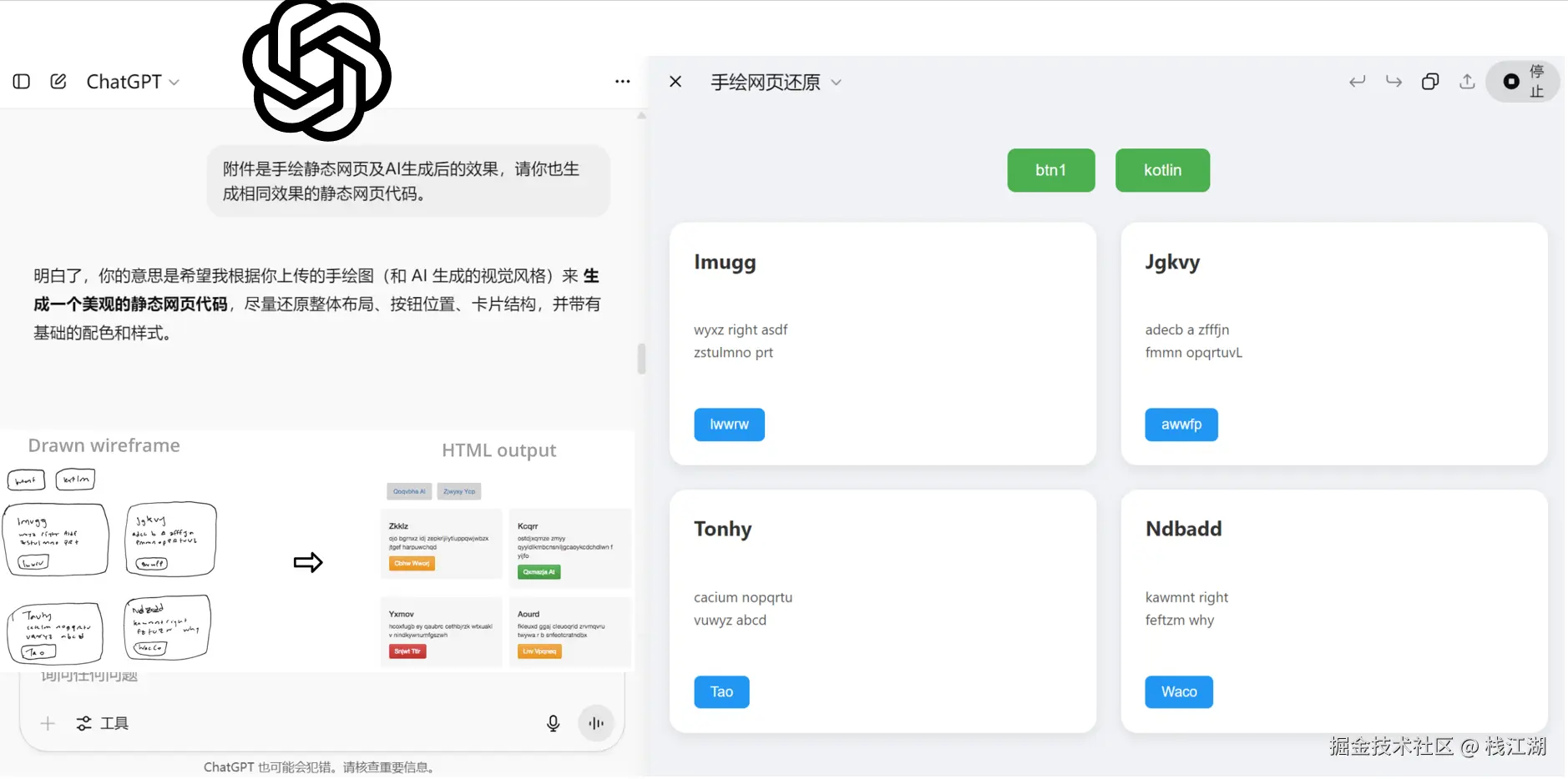这是当时chatgpt发布时,一个非常经典的案例。在纸上手绘一个网页的草图,ChatGPT可以根据图片生成网页的代码,并且可以运行。