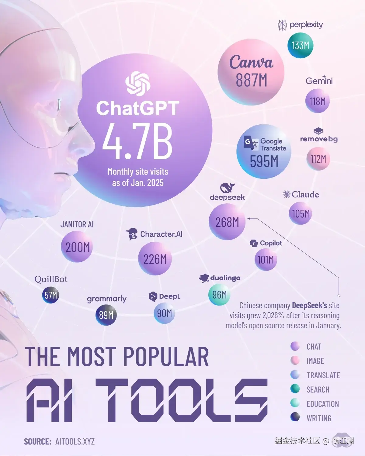 当然这个统计数据还有一点值得我们关注,中国的 DeepSeek流量暴涨 2026% ,达到 2.68 亿次访问,排名第4位。也就是开年那会deepseek登顶App免费下载排行榜。所以没法访问chatgpt的用户deepseek也是不错的选择,很多功能上它已经能比肩chatgpt了,特别是在中文处理的能力上。