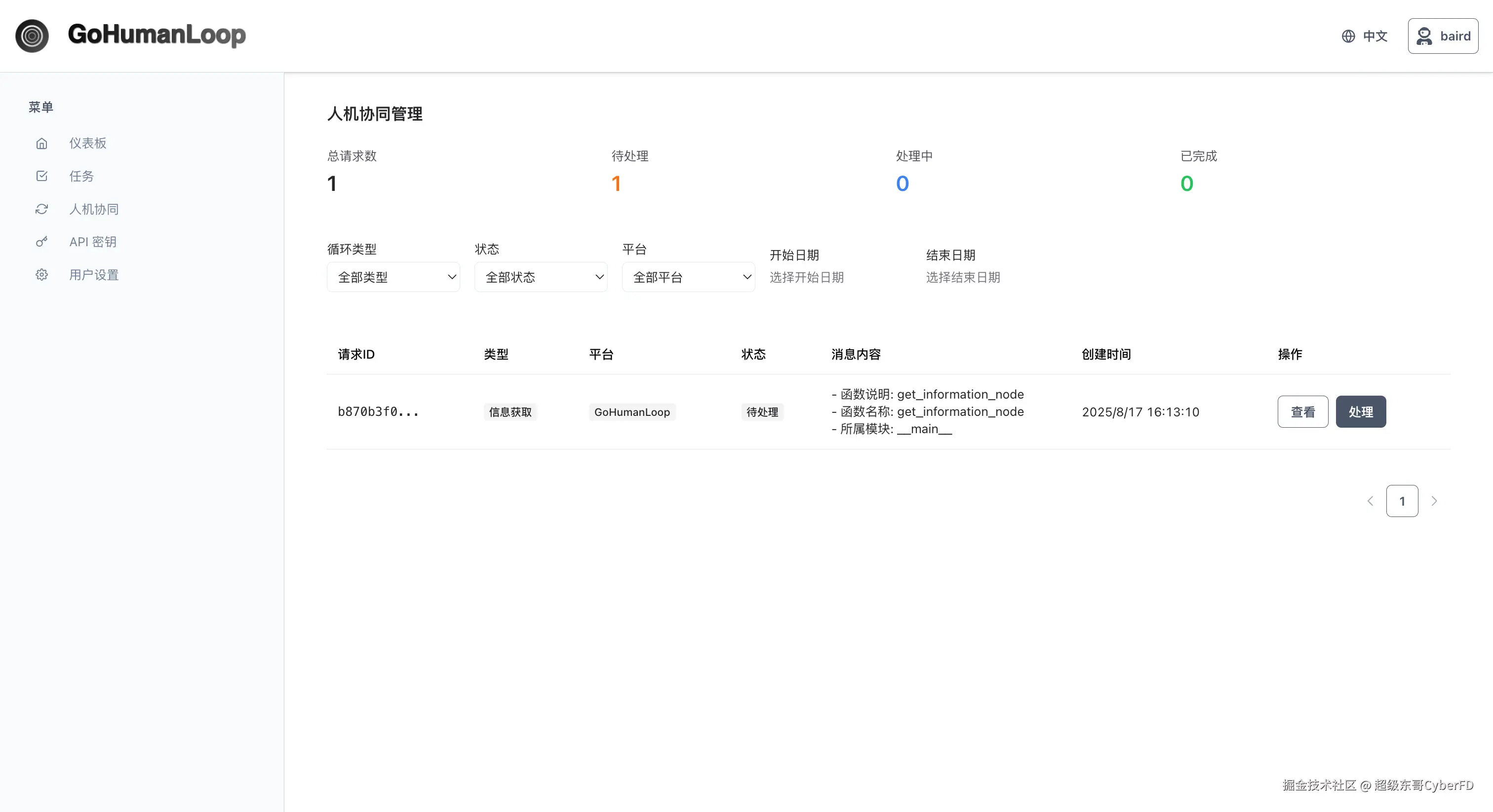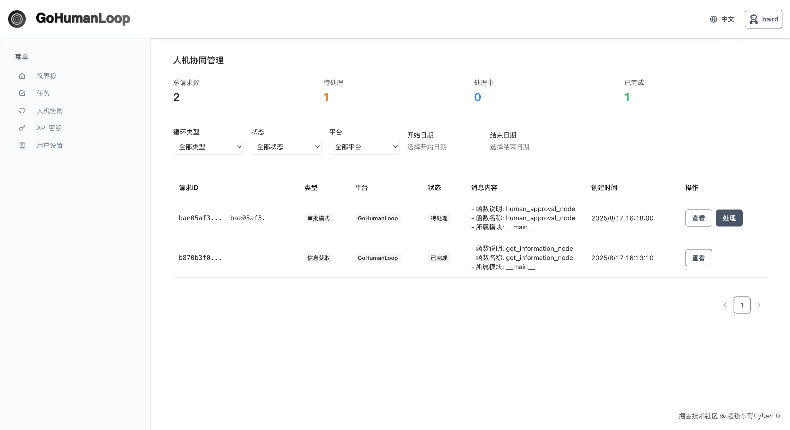GoHumanLoop文档了解更多信息。 - 在人机协同列表中,查看并操作 SDK 传输上来的人机协同请求。