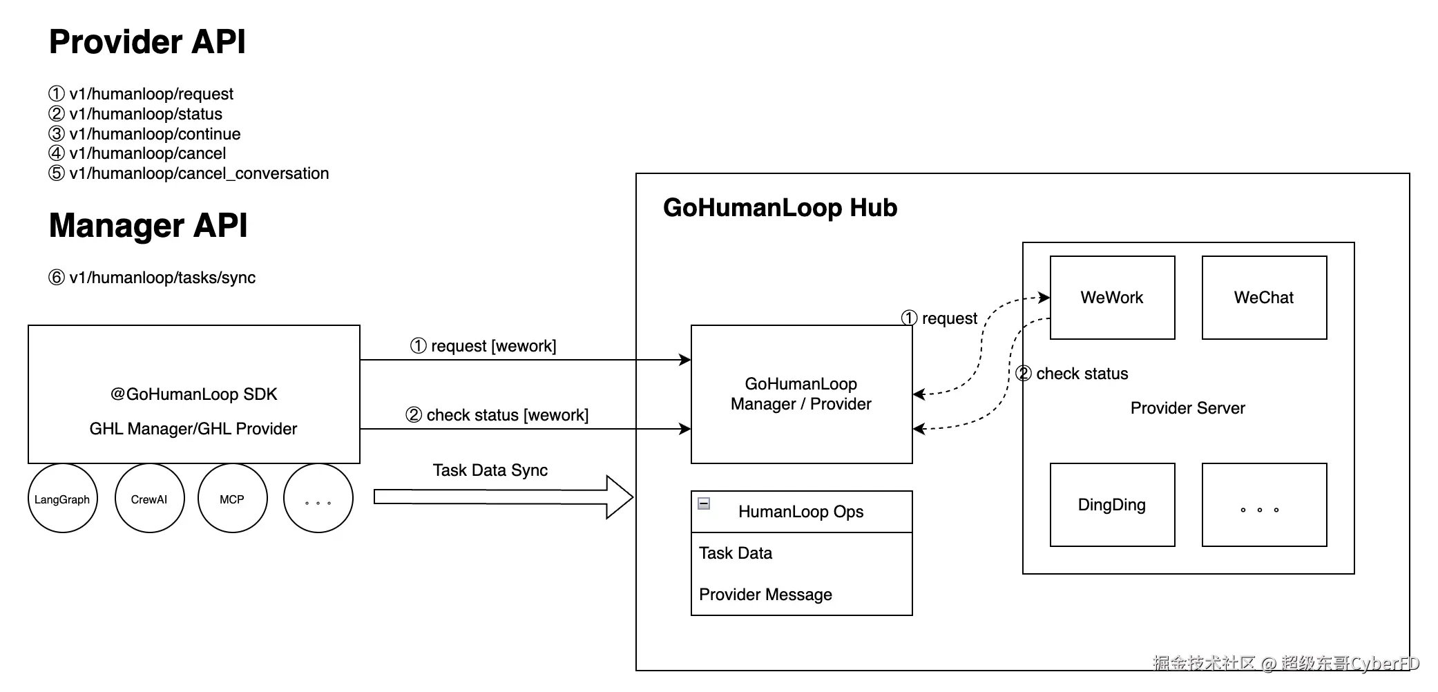 GoHumanLoopSDK 能更好进行人机协同,特别是在类似 Manus 长耗时场景,需要异步与 Agent 进行交互的场景,通过简单的封装即可增强人机协同能力 GoHumanLoop内部提供 HumanLoop 任务管理器和请求处理提供者(Provider),通过 API 方式与 GoHumanLoopHub 进行交互GoHumanLoopHub还能与飞书、企业微信等进行集成,实现与飞书、企业微信等应用的无缝对接。需要依赖一层转换层,目前已提供对应的服务程序例子gohumanloop-feishu和gohumanloop-wework 后续还会继续拓展其它 OA 平台,让人机协同更好的集成到业务当中- 管理人员通过