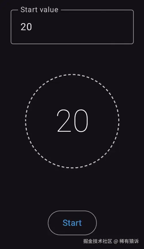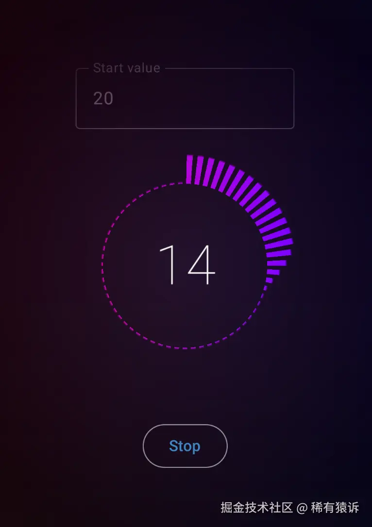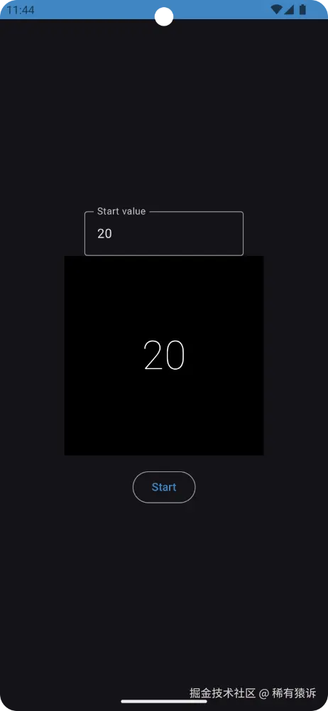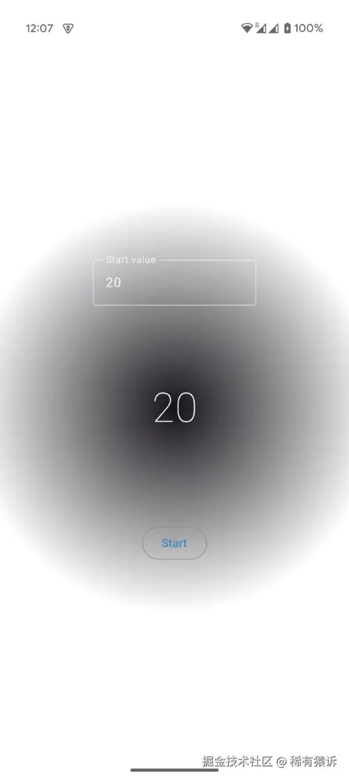 剩下的就是添加计时器本身的逻辑,然后我们就可以开始进入正文了。首先,让我们创建一个 LaunchedEffect 来在计时器运行时更新其值。同时,我们将在此代码块中计算着色器的 percentage。由于我们的着色器会从计时器的起始值向下过渡到零,因此我们需要对 percentage 变量进行归一化,使其相应地从 0 变为 1。代码如下: