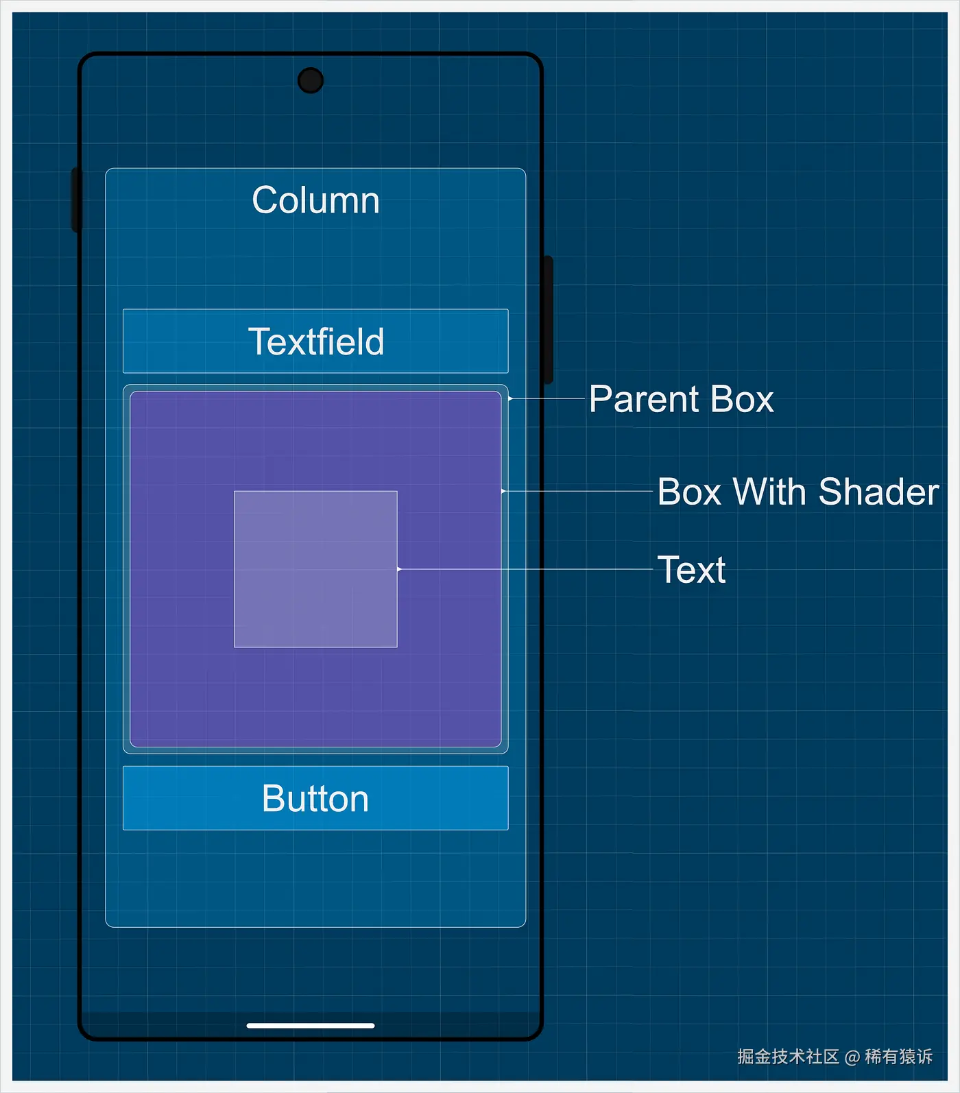 和往常一样,让我们从布局开始。我将基础 Compose 组件命名为“TimerShaderScreen”。在组件内部,我们将从一个“Column”容器开始,该容器顶部包含一个输入字段,后面跟着一个“Box”。这个“Box”在同一层级上包含一个将应用着色器的“Box”和一个显示当前计时器值的“Text”元素(这一点很重要)。从技术上讲,我们可以只使用一个“Box”,但这会使着色器稍微复杂一些。为了简化本教程,我选择了稍微复杂的构图,以使着色器保持简洁。在这个“Box”之后,有一个用于启动计时器的按钮。我提供了一个布局图,以便更清晰地展示,但总的来说,布局本身已经非常简单了。