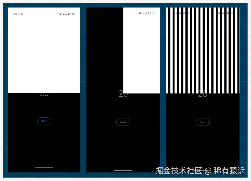 接下来,让我们添加必要的变量并定义整个布局。由于我们尚未准备好着色器,因此你可以暂时跳过“RuntimeShader”变量,只需运行项目并确保一切正常即可。我想强调一个重要的细节:如果你将着色器应用于一个不包含任何内容的“Box”,则需要为其设置背景颜色。这确保它参与合成,从而使我们的效果可见。但是,务必在应用“graphicsLayer”之后设置背景颜色。否则,只会渲染颜色,着色器将不可见。目前,布局应该如下所示: