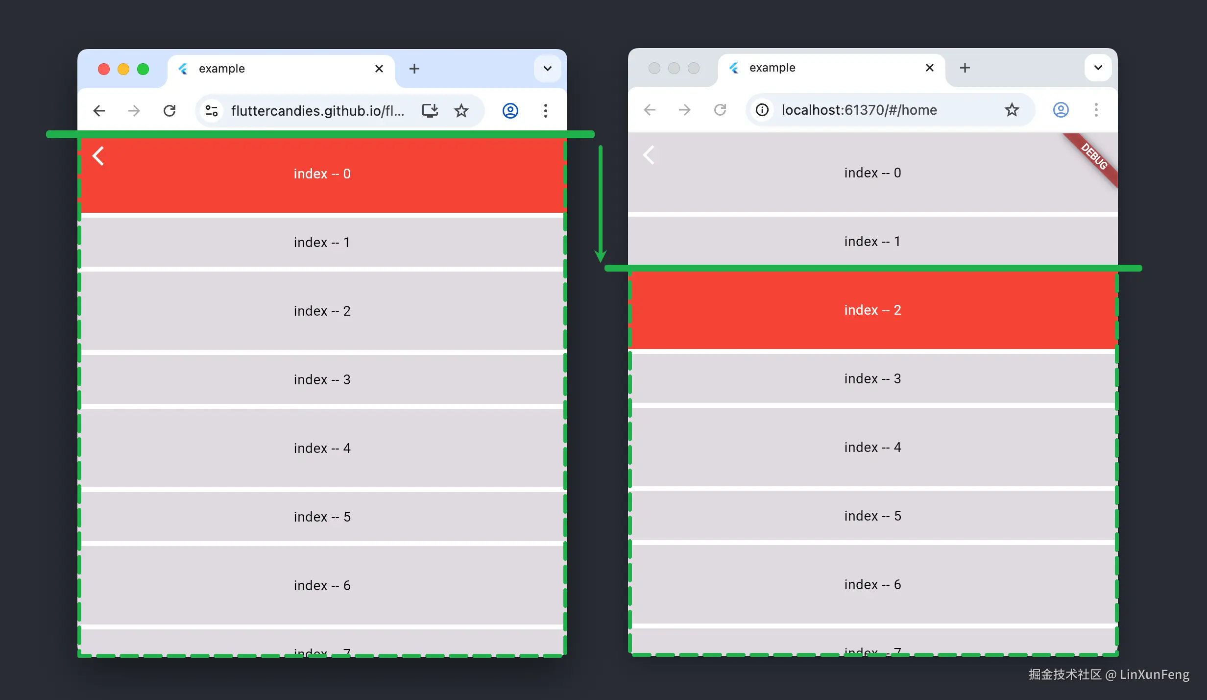1、dynamicLeadingOffset: 用于设置计算可视区域的偏移量,如图中的绿线,一般情况下,判断 ListView 的 item 是否为第一个,主要是看它是否接触绿线,当 dynamicLeadingOffset 返回的值越大,绿线就越向下偏移,计算的可视区域变小,第一个 item 也随之变化。