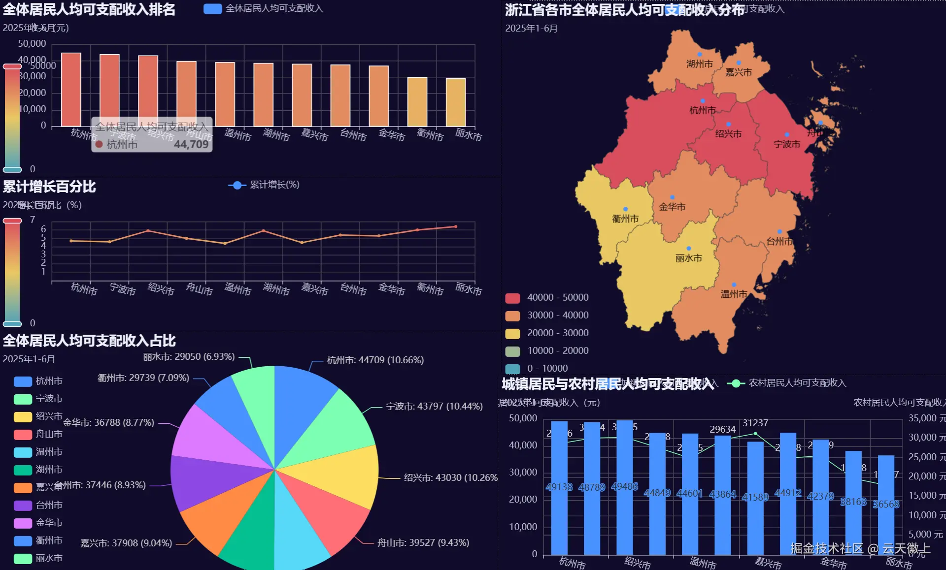 运行上述代码后,会生成一个名为 2025年1-6月浙江省各市居民收入可视化大屏.html 的文件,打开后可以看到以下内容: