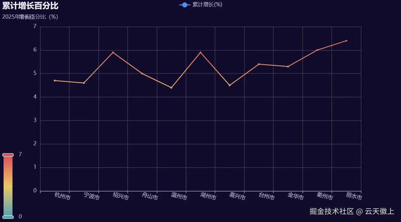 折线图展示了 2025 年 1-6 月浙江省各市全体居民人均可支配收入的累计增长百分比。从图中可以看出,丽水市和衢州市的增长百分比最高,分别达到了 6.4% 和 6.0%。而温州市和嘉兴市的增长百分比较低,分别为 4.4% 和 4.5%。