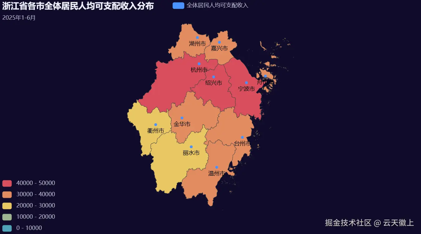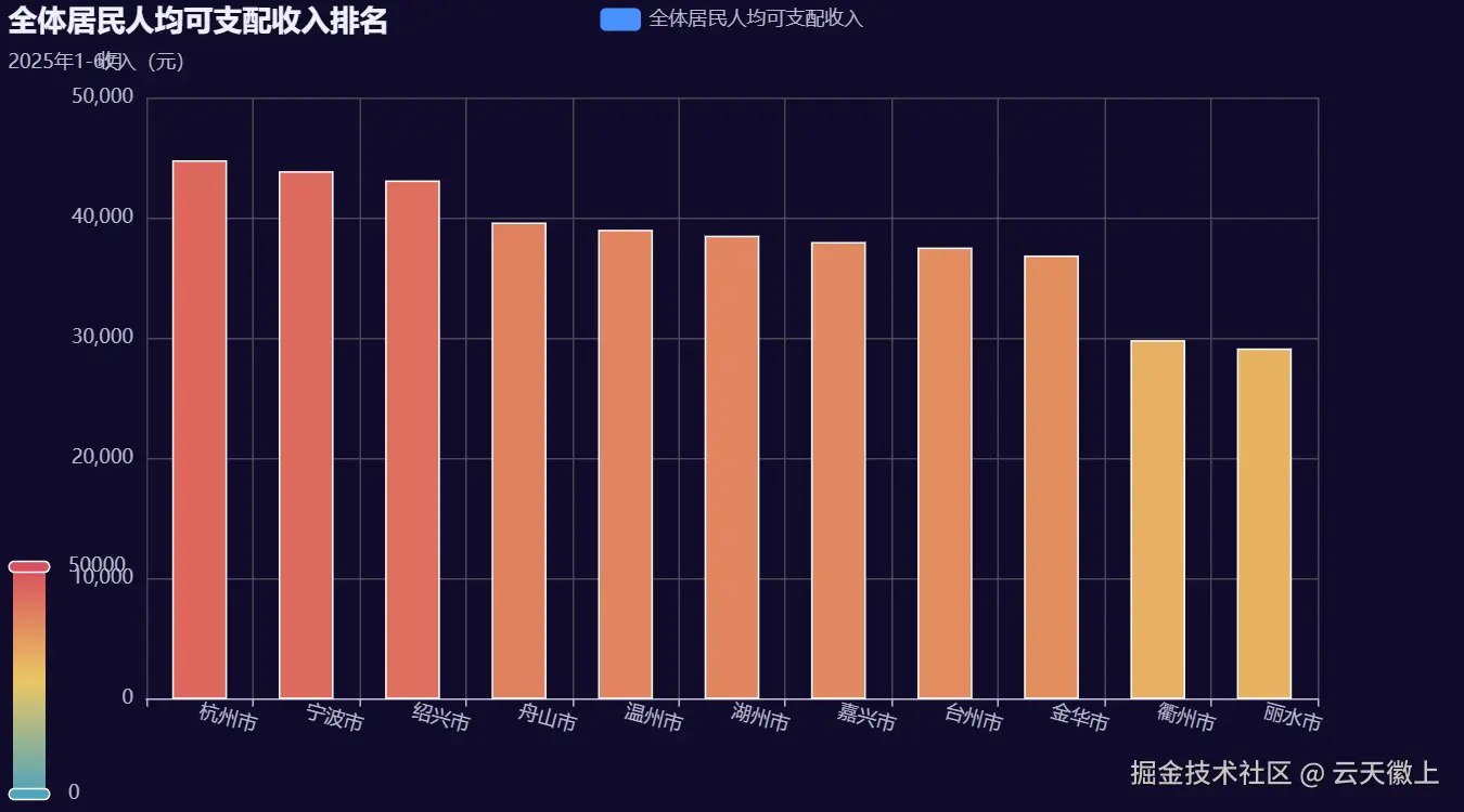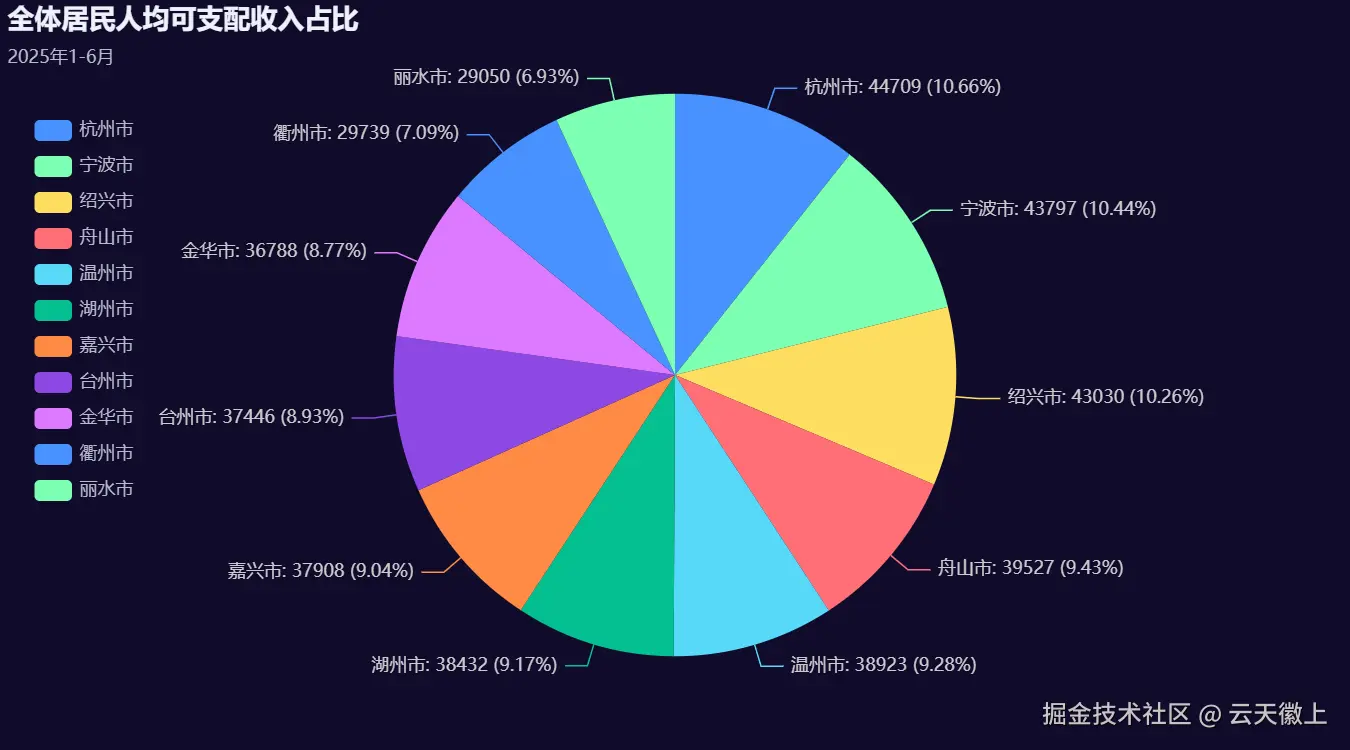 本文将使用 Python 和 Pyecharts 来对 2025 年 1-6 月浙江省各市居民收入数据进行可视化分析,从多个维度展示居民收入的分布情况,并生成炫酷的可视化大屏。