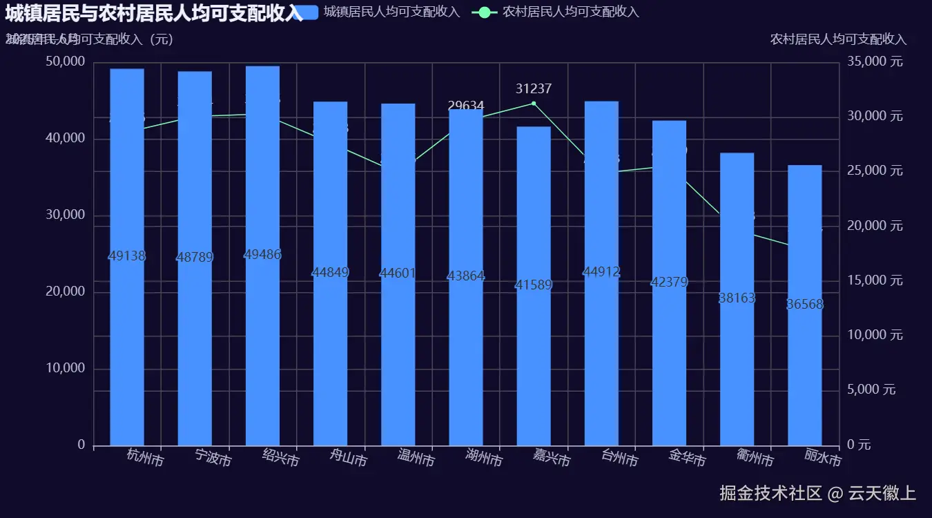 - 区域差异明显:杭州市和宁波市的全体居民人均可支配收入最高,而丽水市和衢州市的全体居民人均可支配收入相对较低。这表明浙江省内各市之间的经济发展水平存在差异。