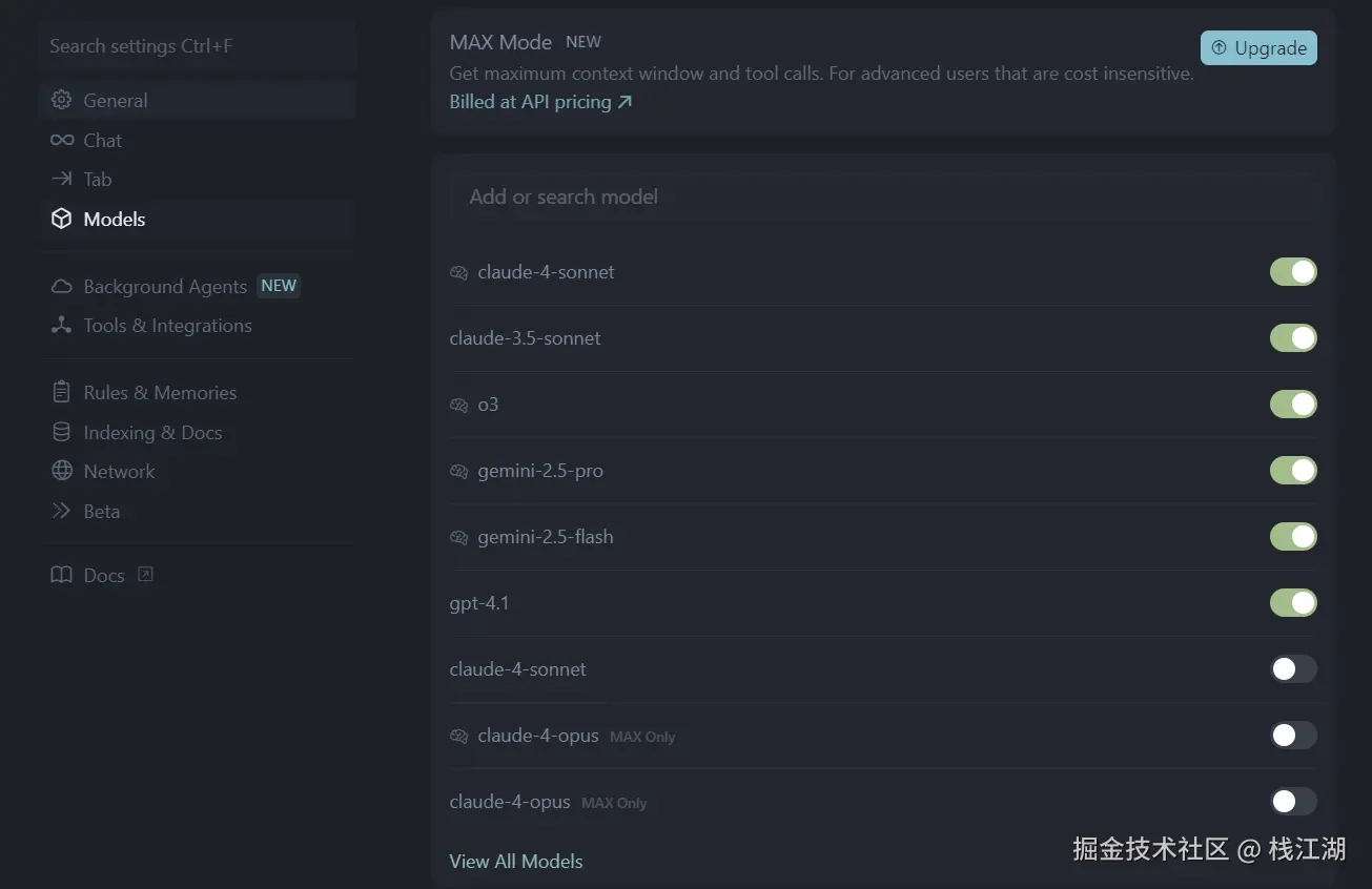 cursor默认自带了claude、gpt、gemini等顶尖的AI大模型,当然免费的用户使用的次数还是有限制的。