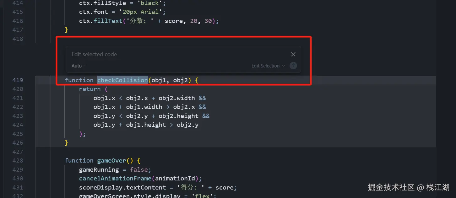 和Github Copilot类似,当你写一行代码时,Cursor 会在你输入的同时尝试补全整段逻辑。Cursor具有强大的自动补全功能,可预测你的下一次编辑。它会根据你最近的更改提供跨多行的代码建议。比如:
