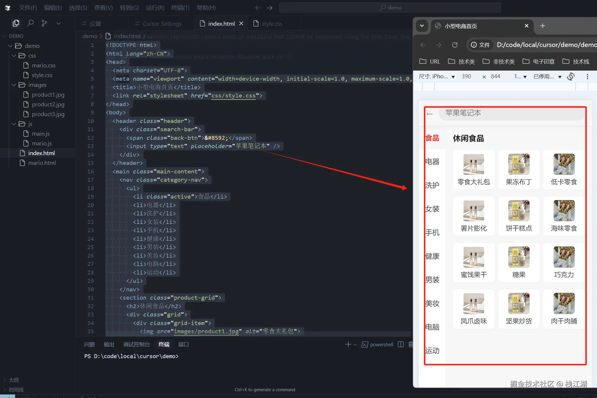 比如我想让cursor生成一个h5的电商网站,在对话窗口输入需求,然后Cursor会把它设计与开发的大概路线列出来,如网站的结构、技术选型、网站项目的目录结构及网站的设计风格。简单的和它交互一下,你也可以针对它列出来的思路增加建议和调整,简单交互后代码就生成了。