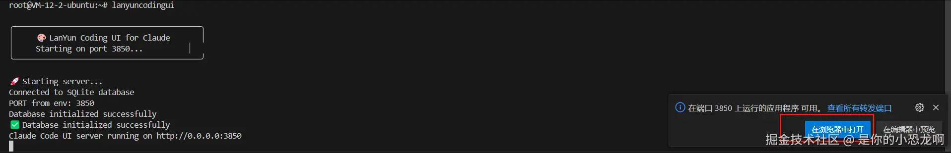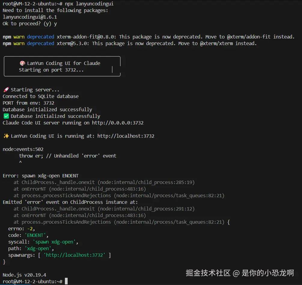 这种情况通常是主机权限问题,我们可以使用管理员权限进行安装:sudo npm install -g lanyuncodingui@latest ,执行后稍等片刻,这次我们看到安装成功了: